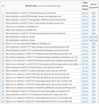 - Tunggu beberapa saat maka list link yang tidak aktif akan tampil seperti gambar di bawah ini. Ada 27 link yang sudah mati di situs , semuanya itu karena artikel titipan dan beberapa artikel yang saya hapus.