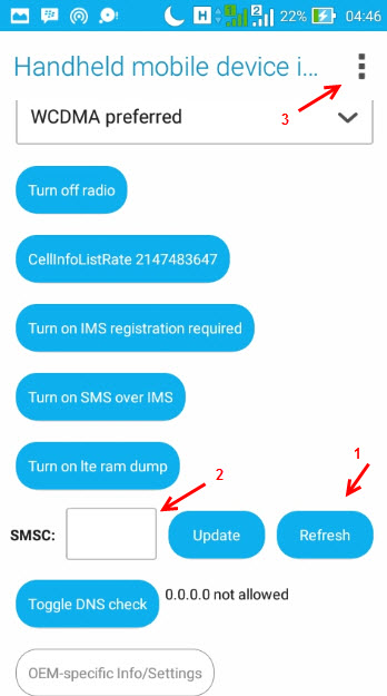 4. Tekan tombol Refresh 1 kali untuk melihat number SMSC pada ponsel anda, untuk ponsel asus zenfone saya yang muncul adalah kode di bawah ini: